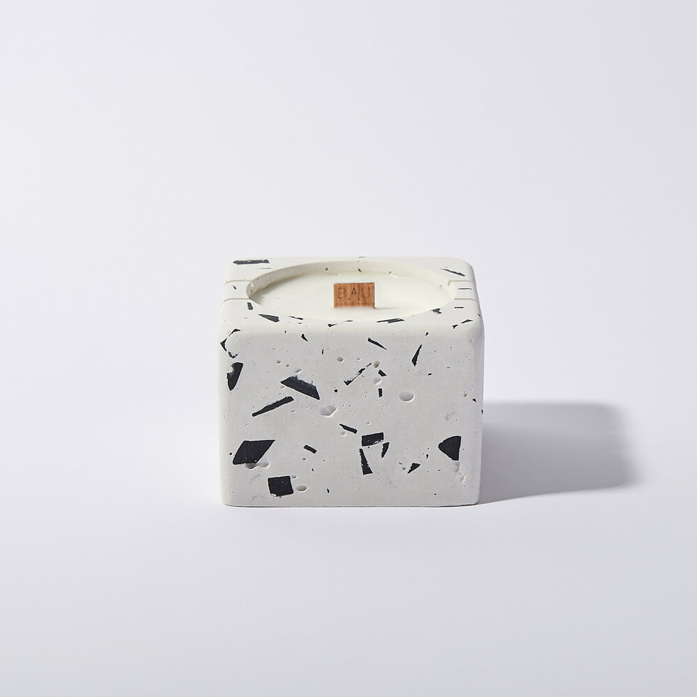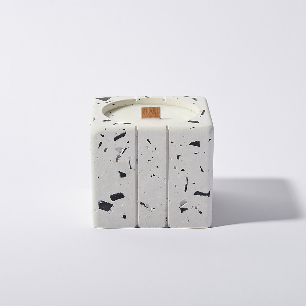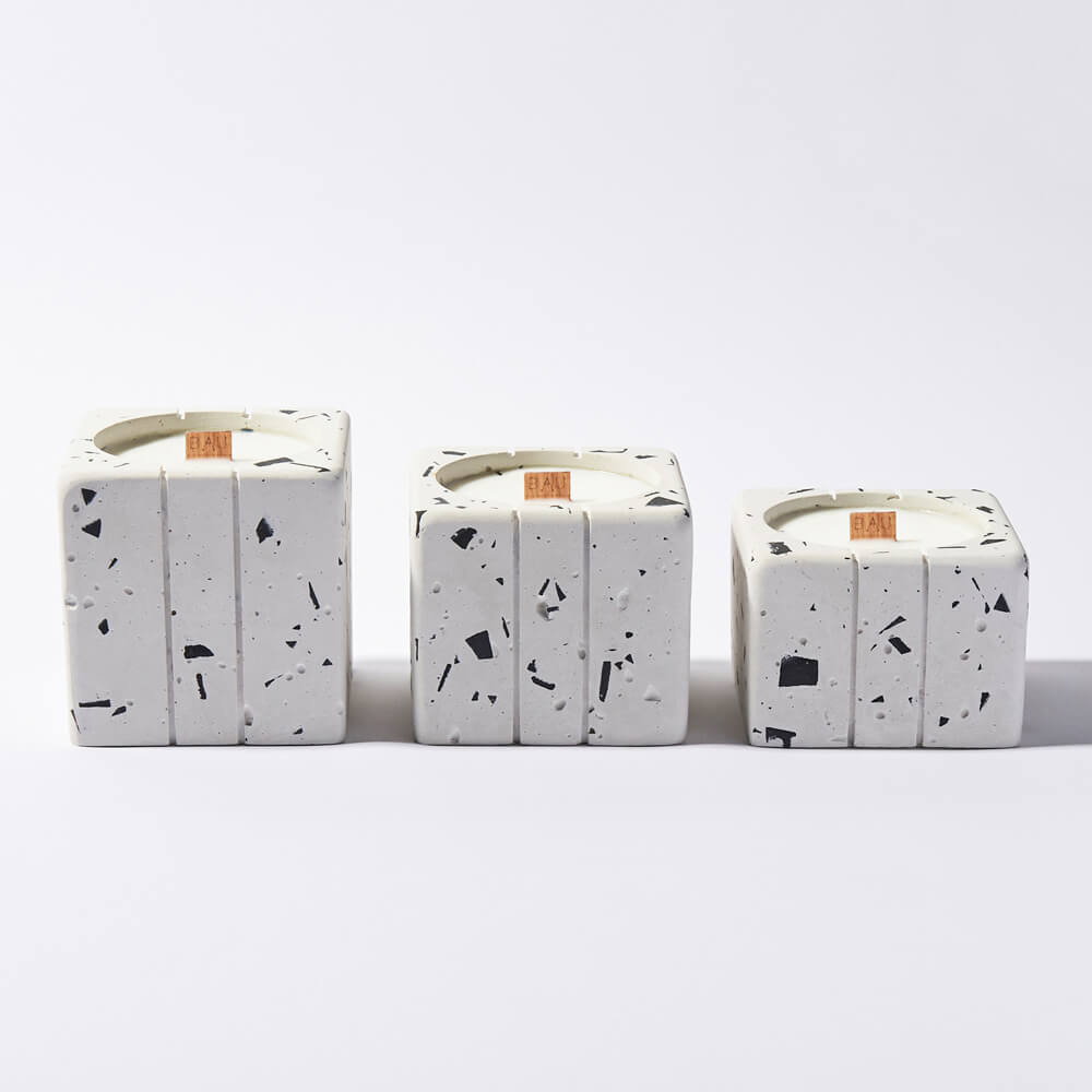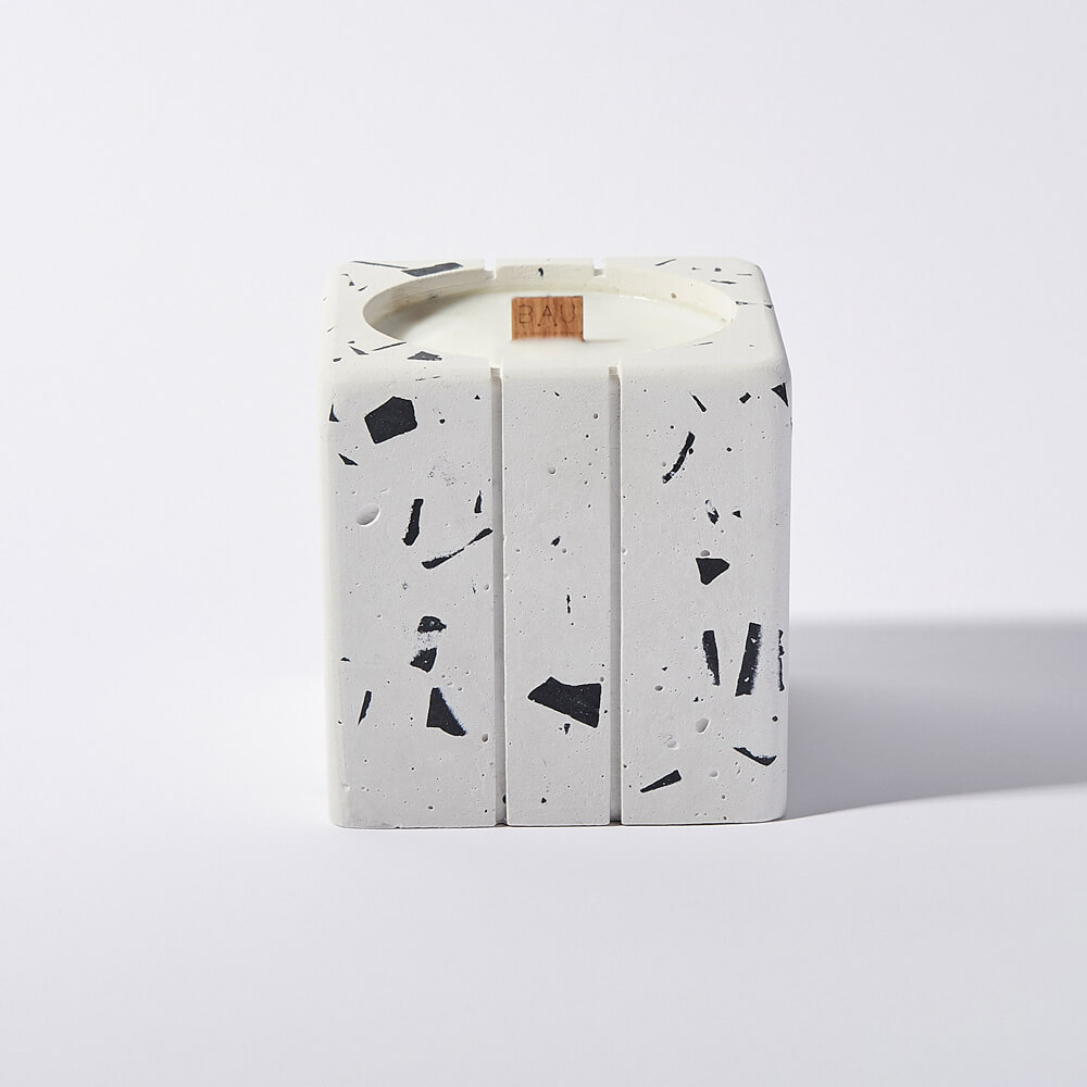 Vela con cera de soja de fragancias naturales, pabilo de madera, envase de terrazo, todo hecho de manera artesanal y 100% mexicano